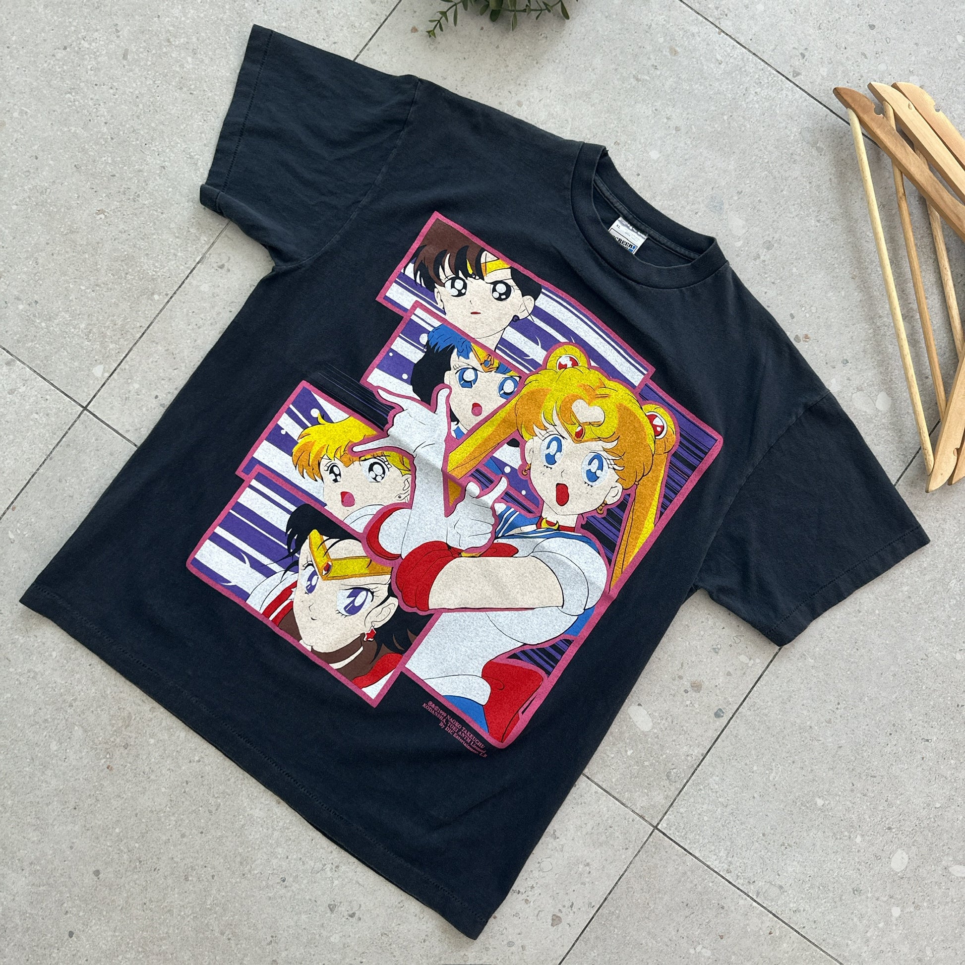 1999 Sailor Moon graphic tee captures the essence of the beloved anime phenomenon that defined a generation. Featuring vibrant, original artwork from the series' golden era, the design showcases iconic characters with crisp detail and colour saturation that has endured remarkably well. The tee's construction reflects late-90s quality standards, with substantial fabric weight and durable screen printing. A genuine piece of anime merchandise history, it appeals equally to dedicated collectors and those seeking authentic vintage pop culture apparel. Condition and sizing details available upon request.